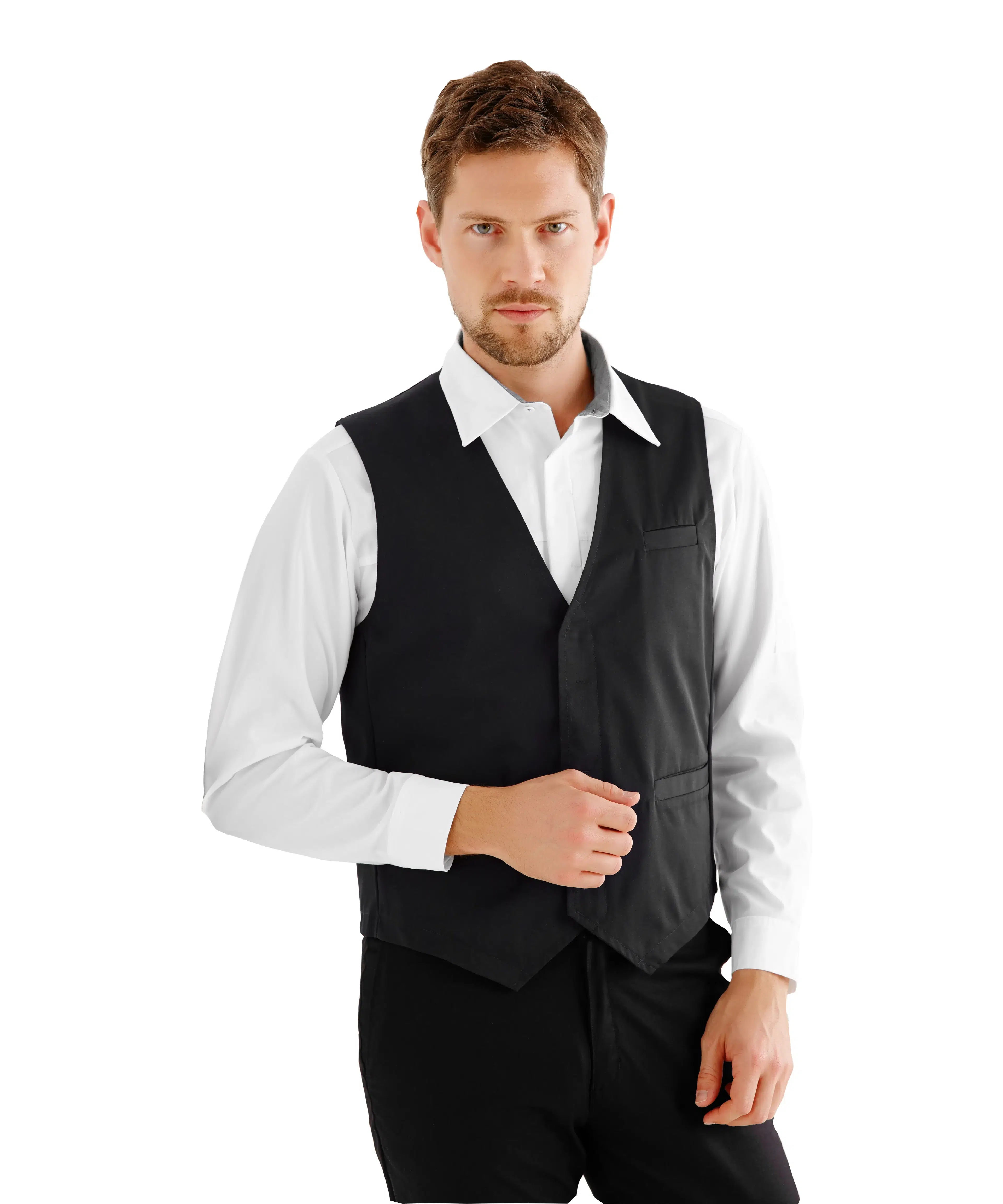 Stylish classic vests. For the esteemed restaurateur and dedicated waiter. For the helpful receptionist. Developed in a timeless design with elegant details and an optimal fit. Comfortable and functional with welt pockets and an inside breast pocket. Designed to create value for people at work. And for professional laundries.