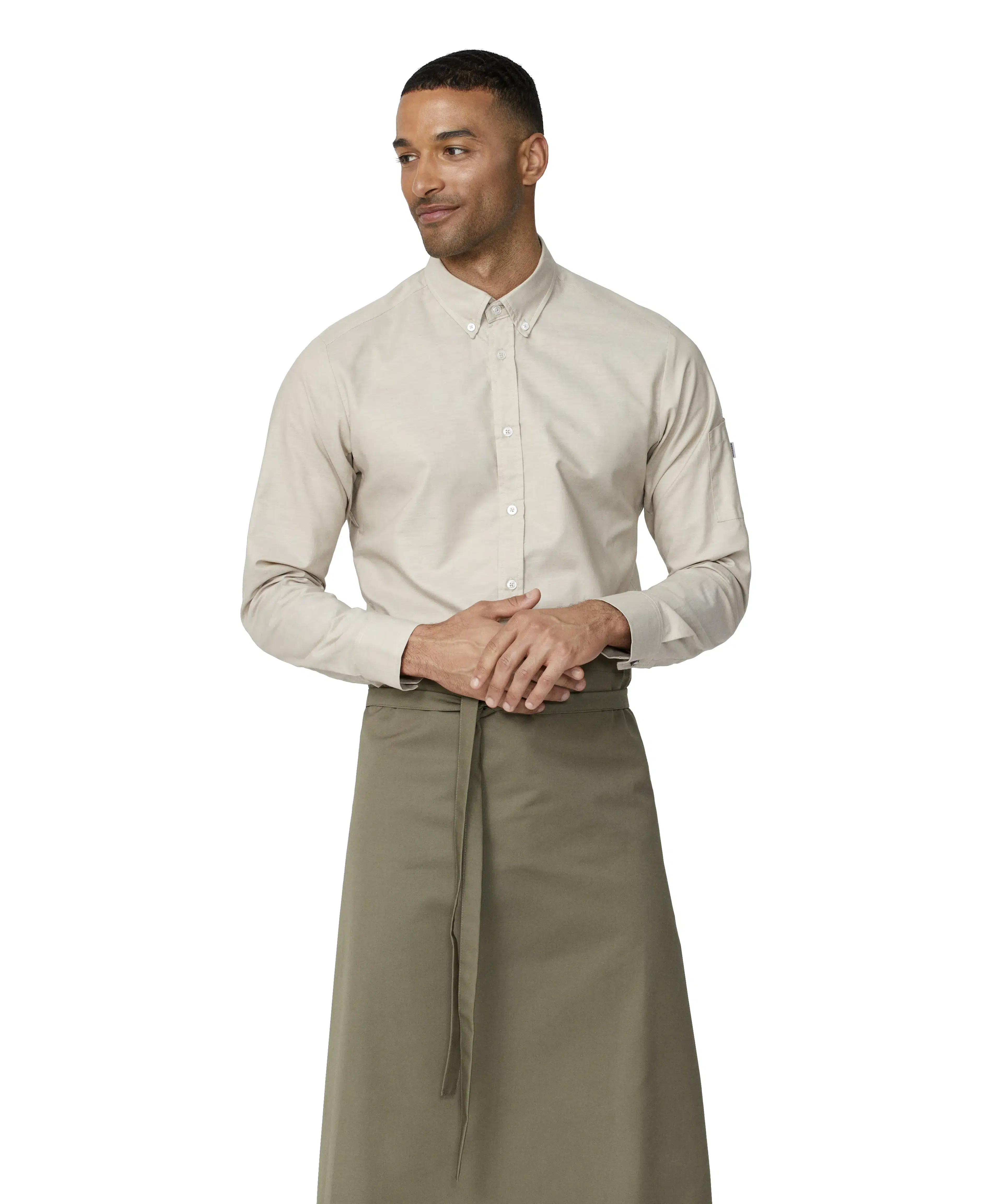- Collar strap with press button for a bib apron